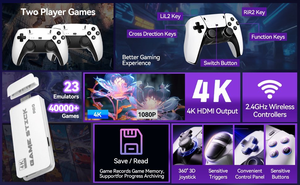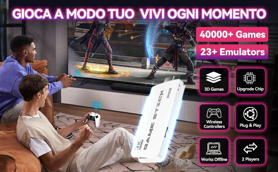 Desde la era de 8 bits hasta los primeros 3D, pasando por arcade y consolas emblemáticas. Todo listo para jugar sin necesidad de internet, descargas ni suscripciones.Ya no necesitas comprar controles adicionales. Con los dos mandos incluidos, puedes revivir los juegos clásicos de manera cooperativa o competitiva tal como en los viejos tiempos.